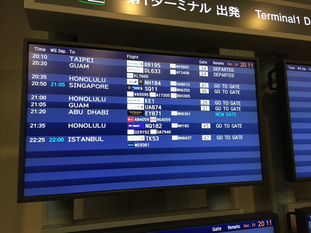 20時35分の便でしたので2時間前の18時35分には着くように16時30分頃自宅を出発しましたが、途中コンビニに寄ったりしていたら17時ぐらいになり、まさかの帰宅ラッシュにハマり、なんだかんだで成田まで2時間30分近くかかってしまい、到着したのは出発時刻1時間半前の19時頃になってしまいました。
