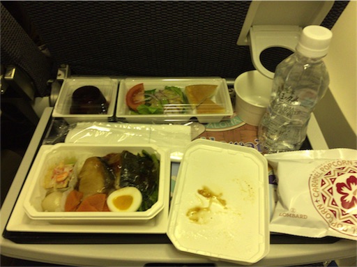 私は以前の記事でも書いたように最後尾の席を予約しましたので、食事が配られるのは一番最後で、時間で言うとたぶん21時30分ぐらいだったと思います。